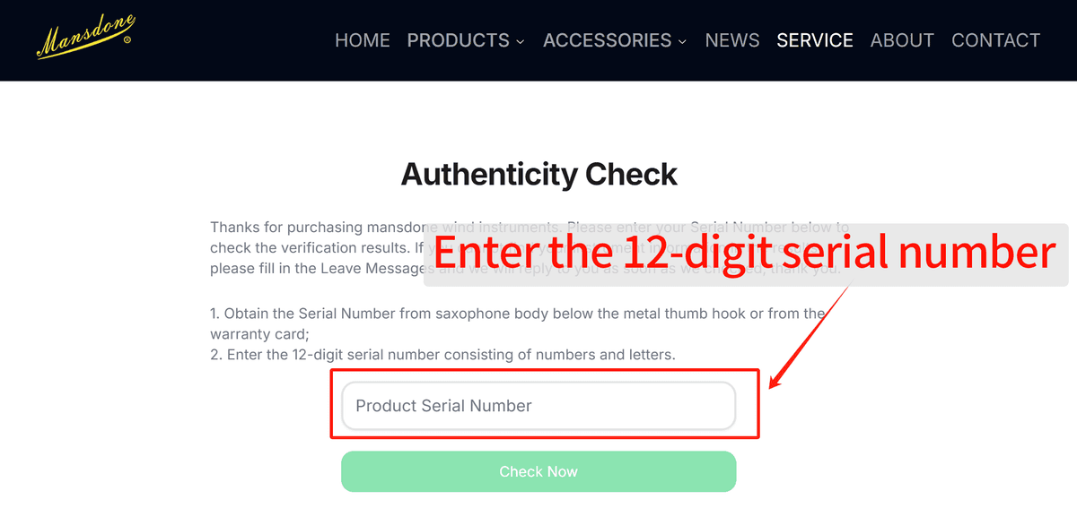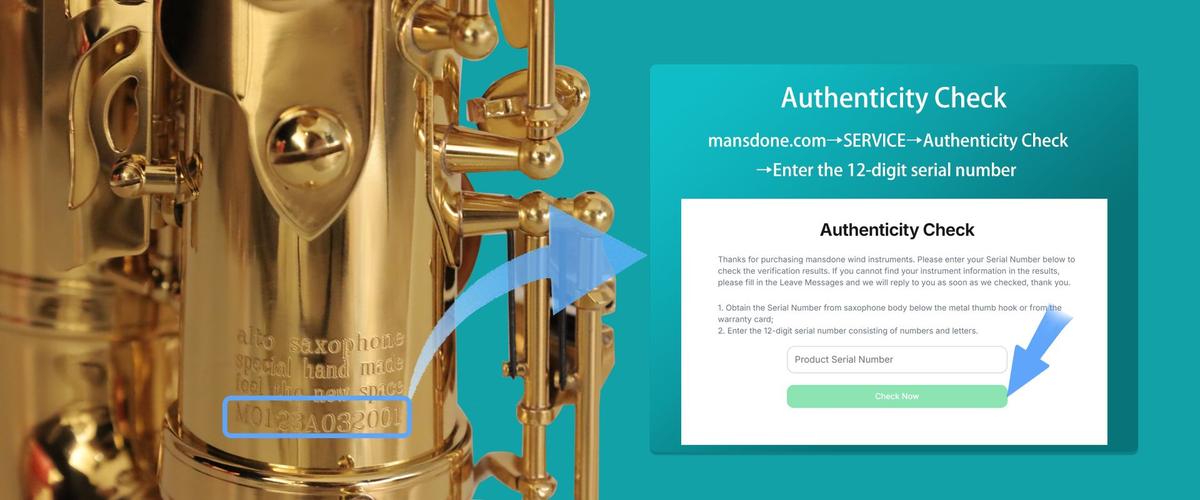 Here, Mansdone saxophones authentic can be checked on our official website, mansdone.com→SERVICE→Authenticity Check→Enter the 12-digit serial number.