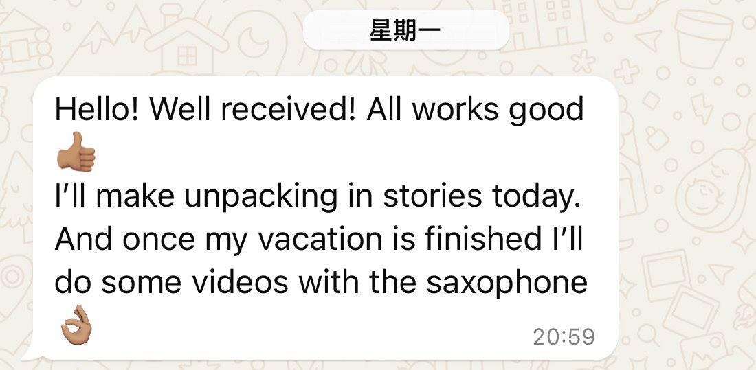 Hello! Well received! All works good I'll make unpacking in stories today. And once my vacation is finished I'll do some videos with the Mansdone saxophone.